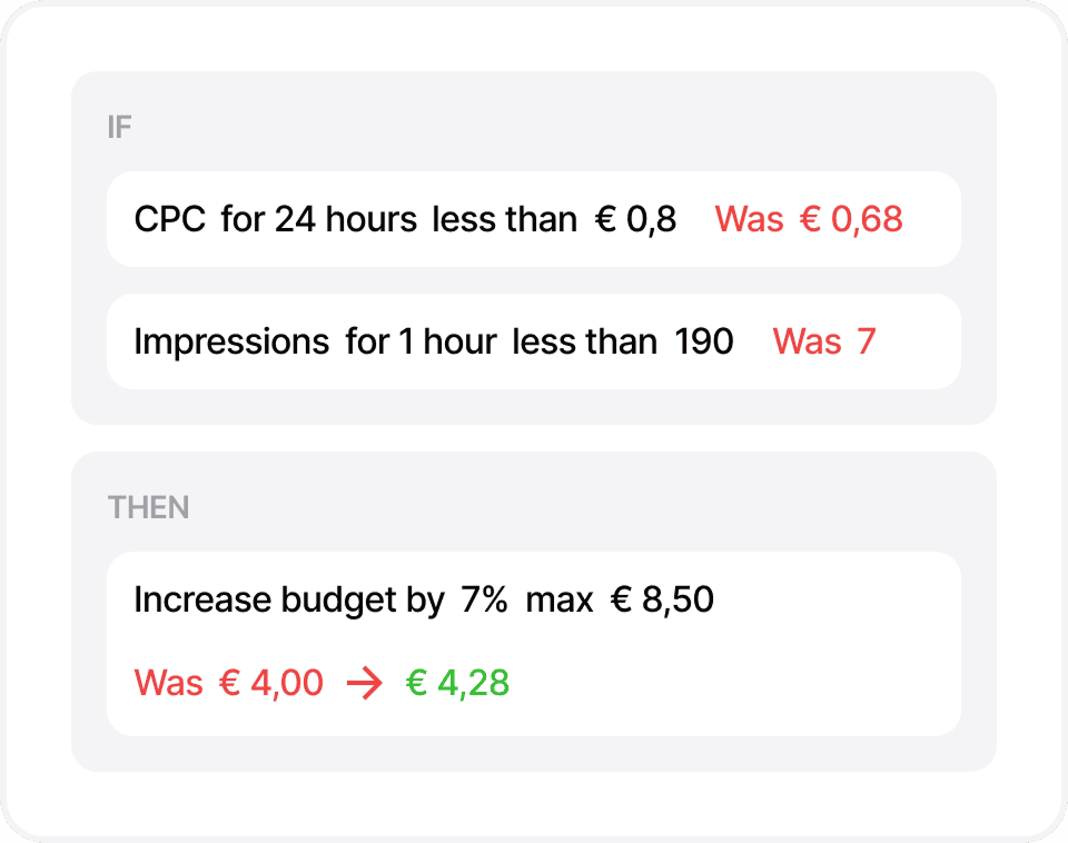 Configure condition checks as often as every 10 minutes. React to auction spikes here and now, not the next day when the budget is already spent.